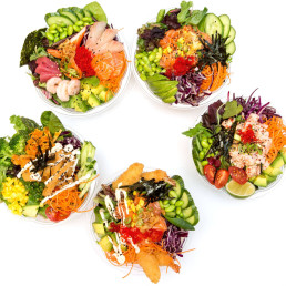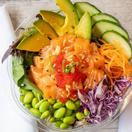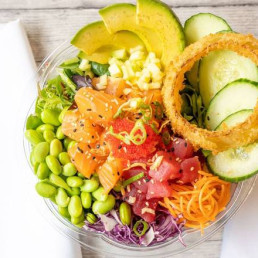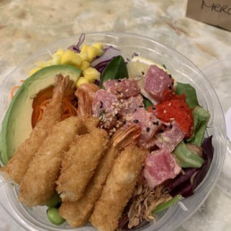 The Pink Shrimp Salad is a must-try, with succulent shrimp tossed in a homemade sauce, served on a bed of spring mix salad with a medley of vegetables. For a heartier option, the Tuna and Salmon Poke Bowl is a delightful combination of sushi rice, tuna, salmon, and an array of toppings, all drizzled with their homemade sauce.